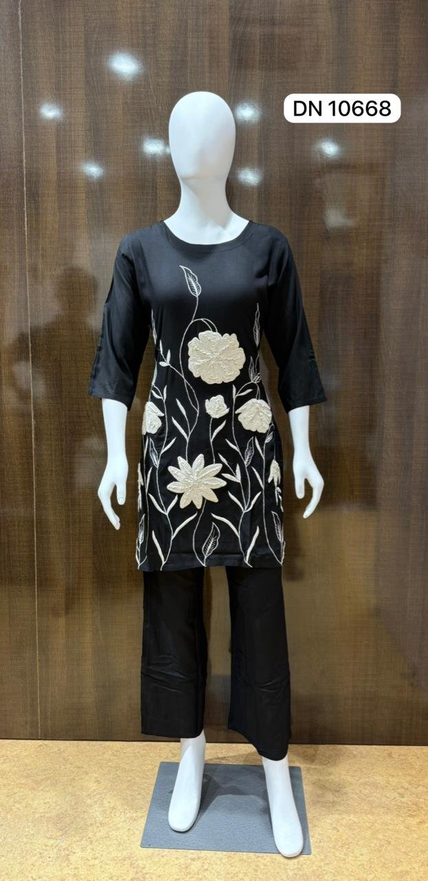 Effortless elegance meets timeless design in this striking black tunic, adorned with intricate white floral embroidery. Perfect for every place weather it is office or an outing with your friends.