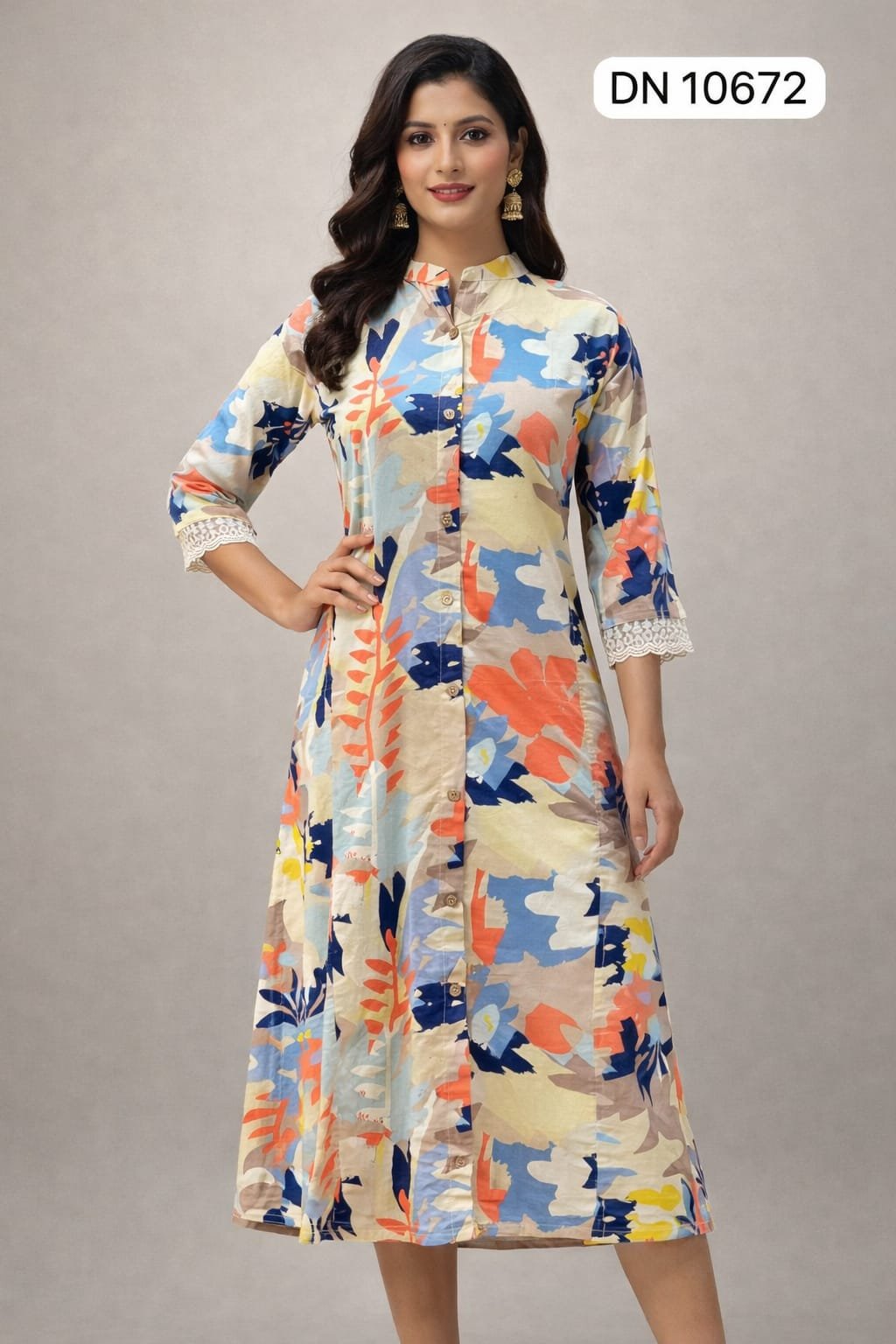 Step into effortless style with this vibrant, multi-colored floral midi dress, featuring delicate lace-trimmed sleeves and a modern button-down silhouette. Perfect for brightening any occasion, its artistic print and breezy design offer a seamless blend of contemporary flair and timeless comfort perfect for summers.