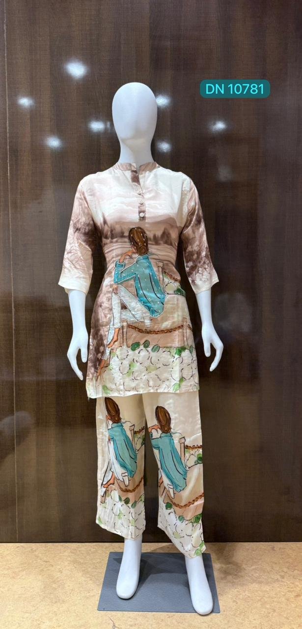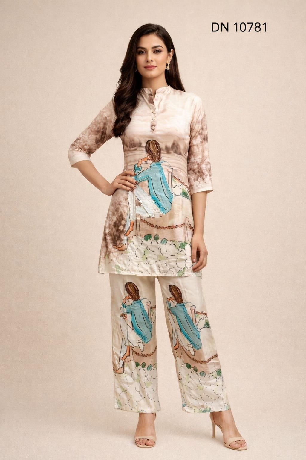 Step into a world of serene artistry with this digital printed co-ord set, featuring a tranquil landscape and a dreamer gazing toward the horizon. Crafted for the modern woman who values both comfort and a unique narrative style, this ensemble blends soft hues with a contemporary straight-cut silhouette.