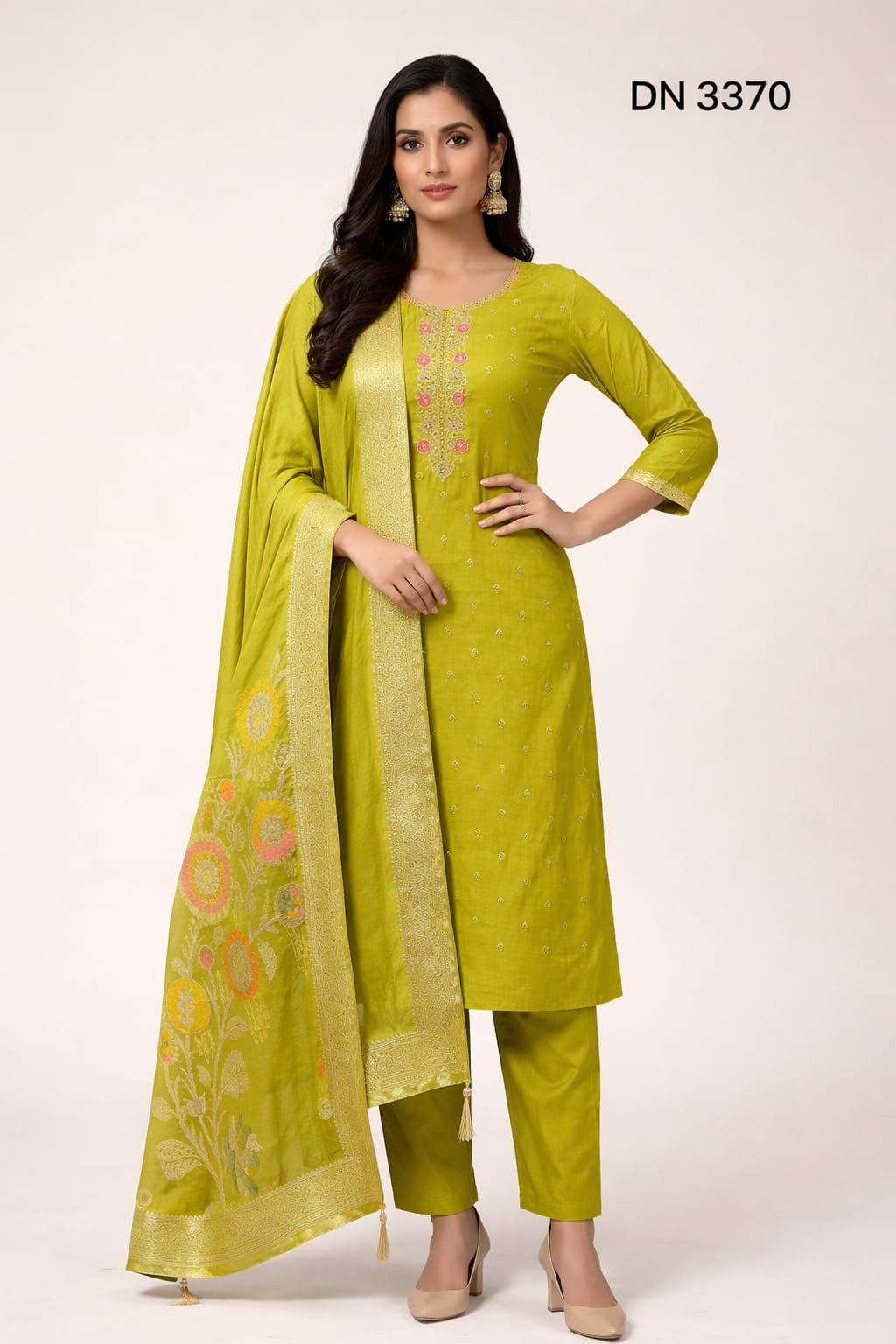 Vibrant lime-green suit, featuring exquisite floral embroidery and a shimmering gold-bordered dupatta. It is the perfect blend of traditional craftsmanship and modern style for your next special occasion.